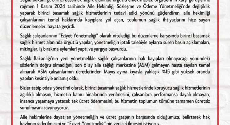 Sağlık Bakanlığı, birinci basamak sağlık alanında örgütlü emek-meslek örgütlerinin karşı görüşlerine rağmen 1 Kasım 2024 tarihinde Aile Hekimliği Sözleşme ve Ödeme Yönetmeliği’nde değişiklik yaparak birinci basamak sağlık hizmetlerinin tedavi edici yönünü güçlendiren, aile hekimliği çalışanlarının temel haklarında kayıplara yol açan, toplumun sağlık ihtiyaçlarını hiçe sayan düzenlemeleri hayata geçirdi.