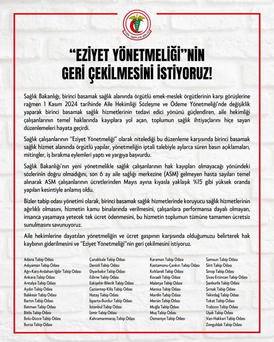 Aile hekimlerine dayatılan yönetmeliğin ve ücret gaspının karşısında olduğumuzu belirterek hak kaybının giderilmesini ve “Eziyet Yönetmeliği”nin geri çekilmesini istiyoruz.