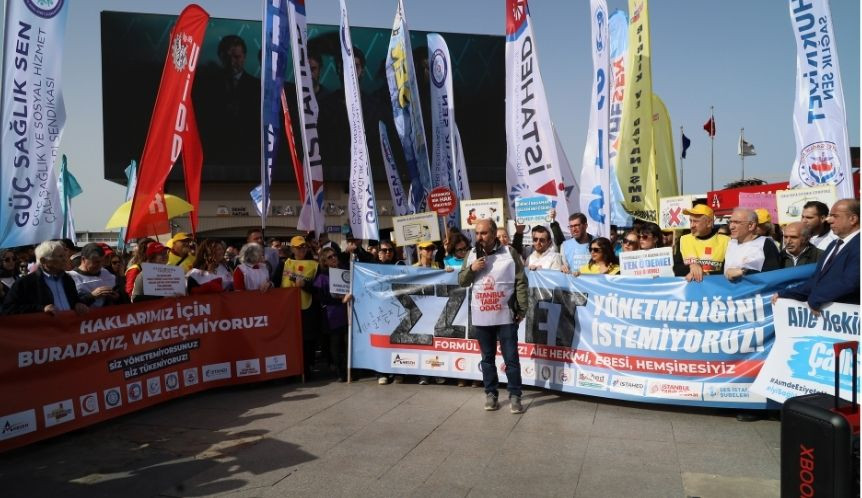 İstanbul Sağlık Platformu’nun çağrısıyla aile sağlığı merkezi (ASM) çalışanları 15 Şubat 2026 günü Kadıköy Rıhtım Meydanı’nda “Aile Hekimliğinde Eziyete Son” başlıklı bir basın açıklaması düzenledi.